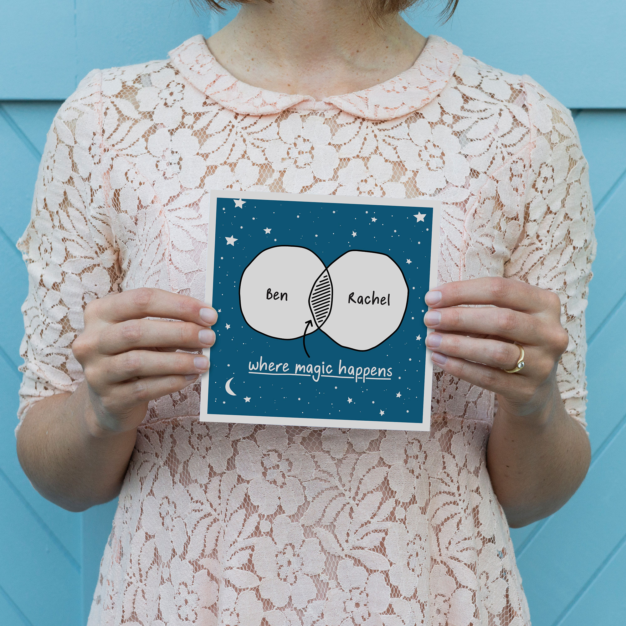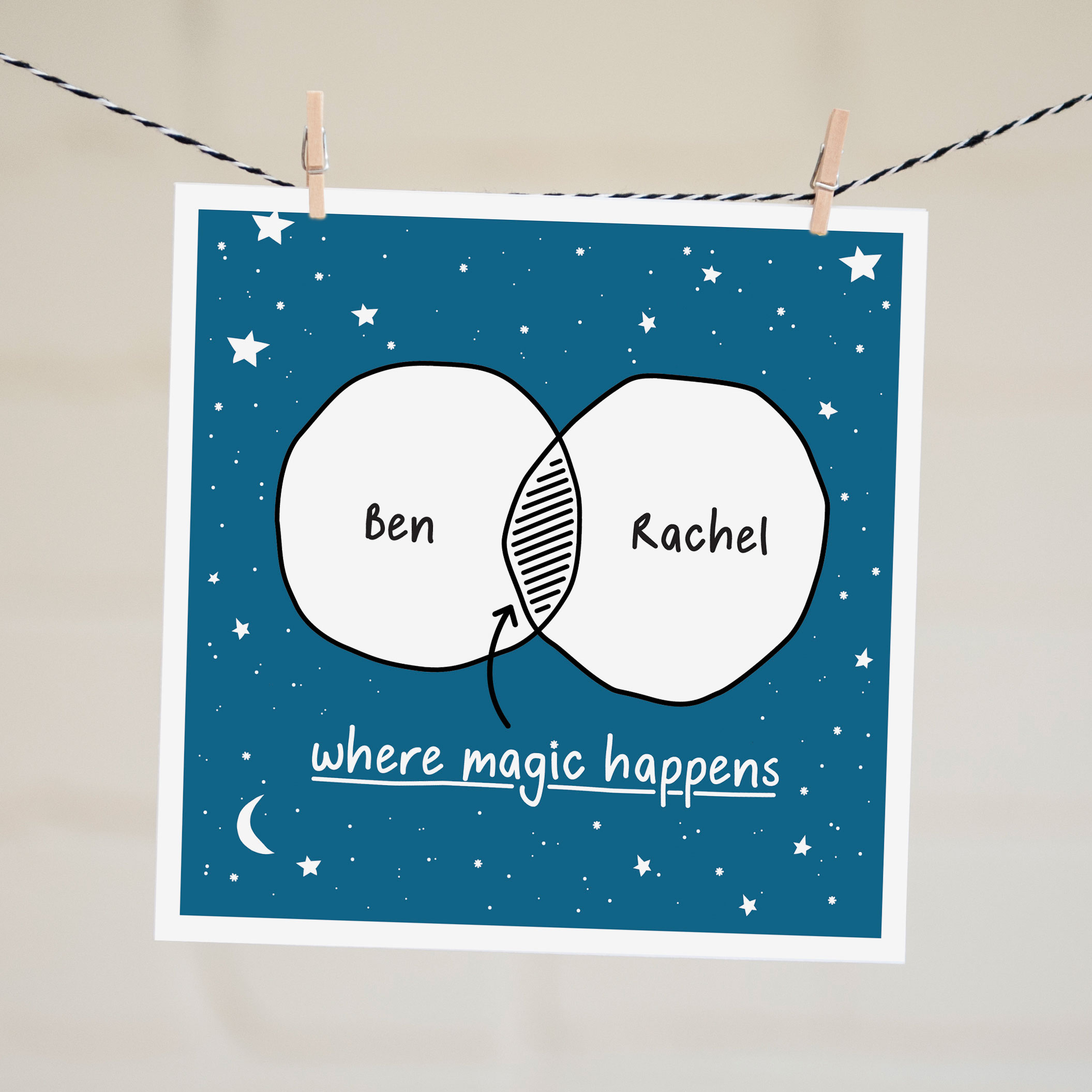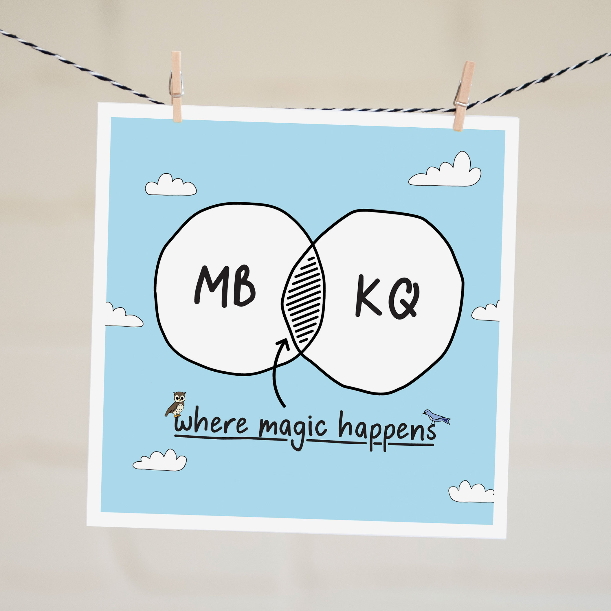 So just include the names or initials you would like in the venn diagram circles in the ‘order notes’ field on the checkout page. Please note, when choosing the name option, shorter names (less than 10 letters) work best. This sweet and square card features original illustrations and typography and is blank so you can write your own message of love.