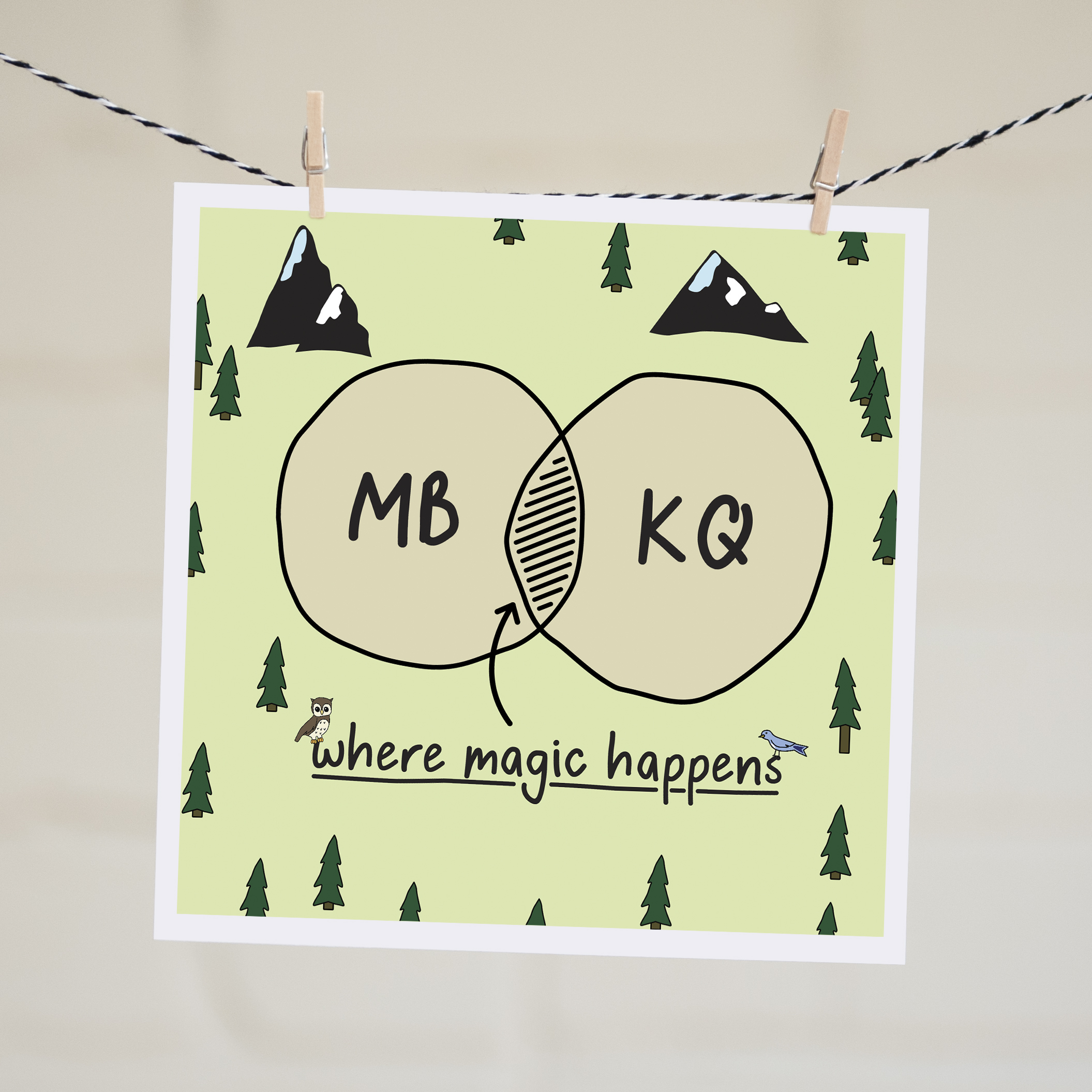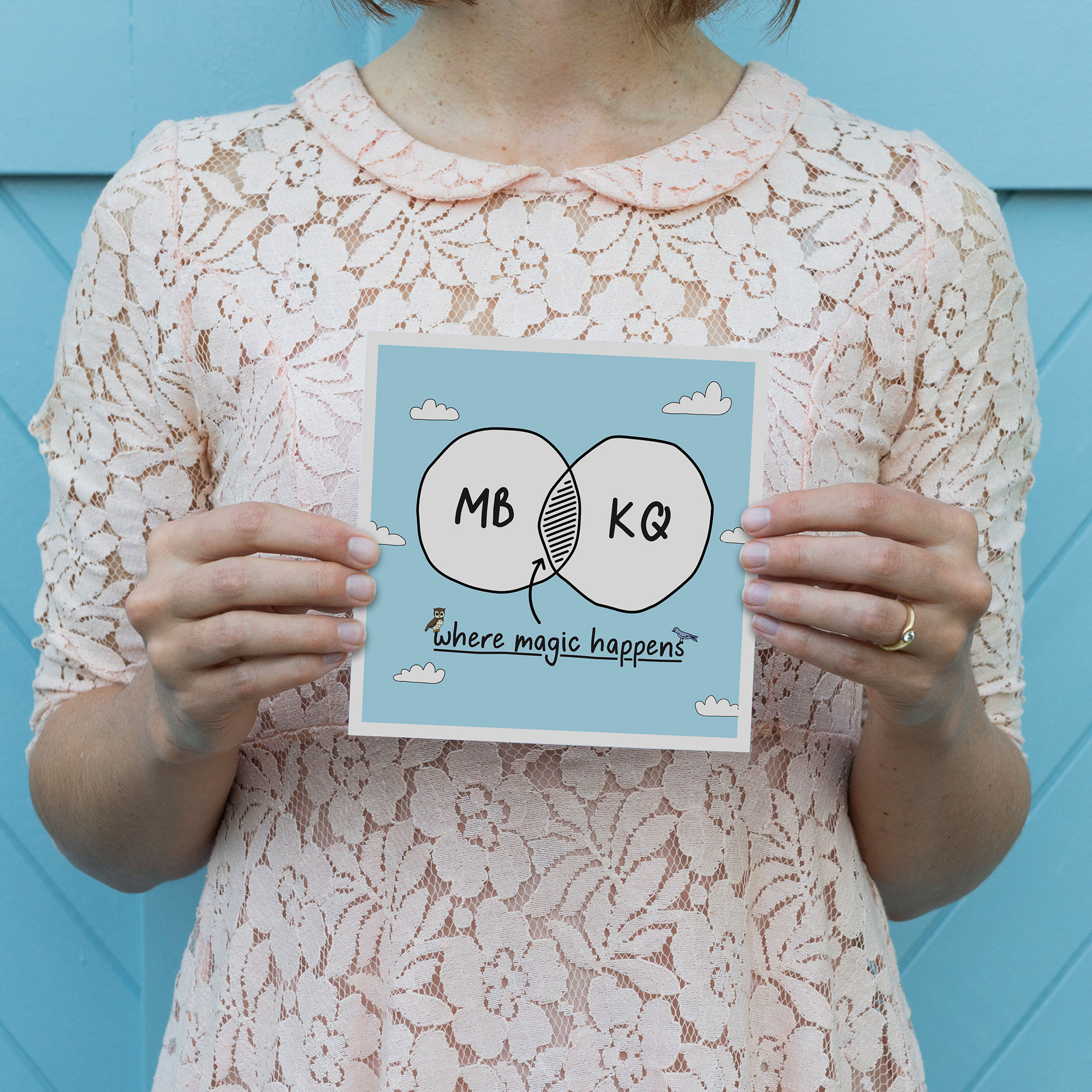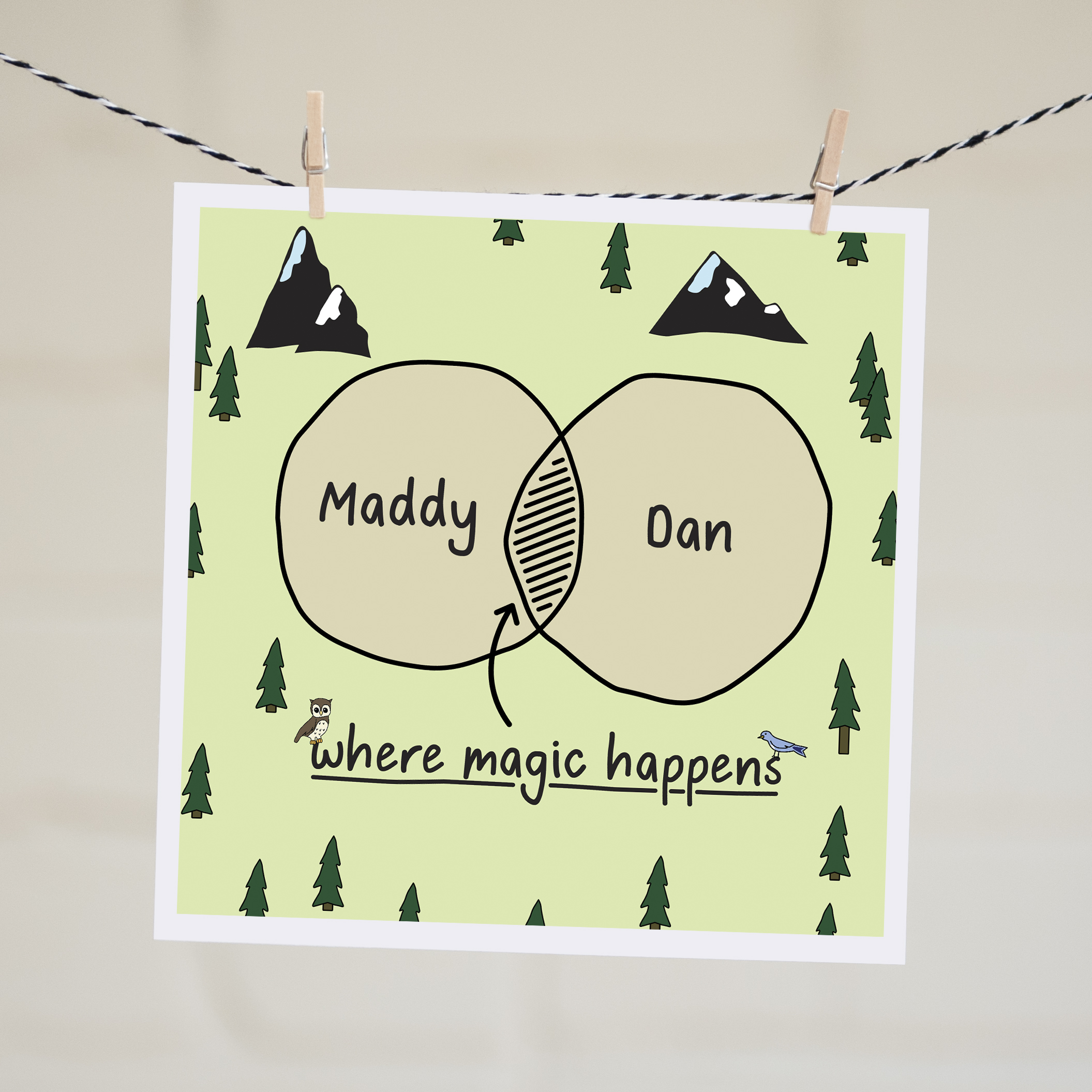 So just include the names or initials you would like in the venn diagram circles in the ‘order notes’ field on the checkout page. Please note, when choosing the name option, shorter names (less than 10 letters) work best. This sweet and square card features original illustrations and typography and is blank so you can write your own message of love.