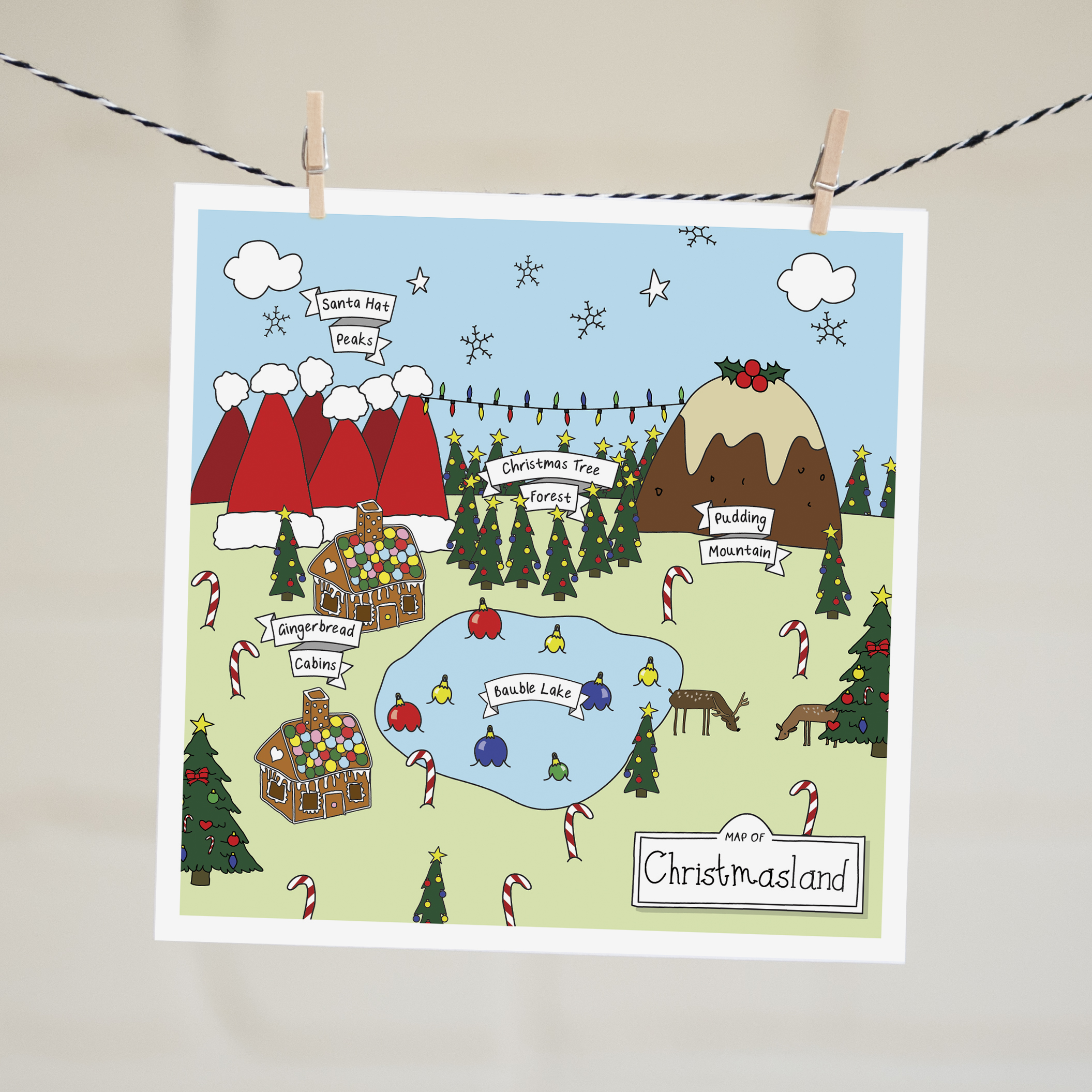 This Christmas card welcomes you to Christmasland, where you can stay in the gingerbread cabins, walk through the Christmas Tree forest and climb pudding mountain! This Christmas card is the perfect way to say ‘Merry Christmas’ to your loved one.